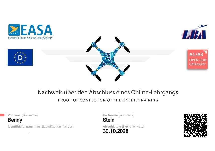 Der „kleine Drohnenschein“ ist die umgangssprachliche Bezeichnung für den EU-Kompetenznachweis A1/A3. Er ist verpflichtend, wenn du Drohnen mit einem Gewicht von über 250 Gramm oder mit Kamera fliegst – selbst wenn sie leichter sind – und du dich in der offenen Kategorie A1 oder A3 bewegst.